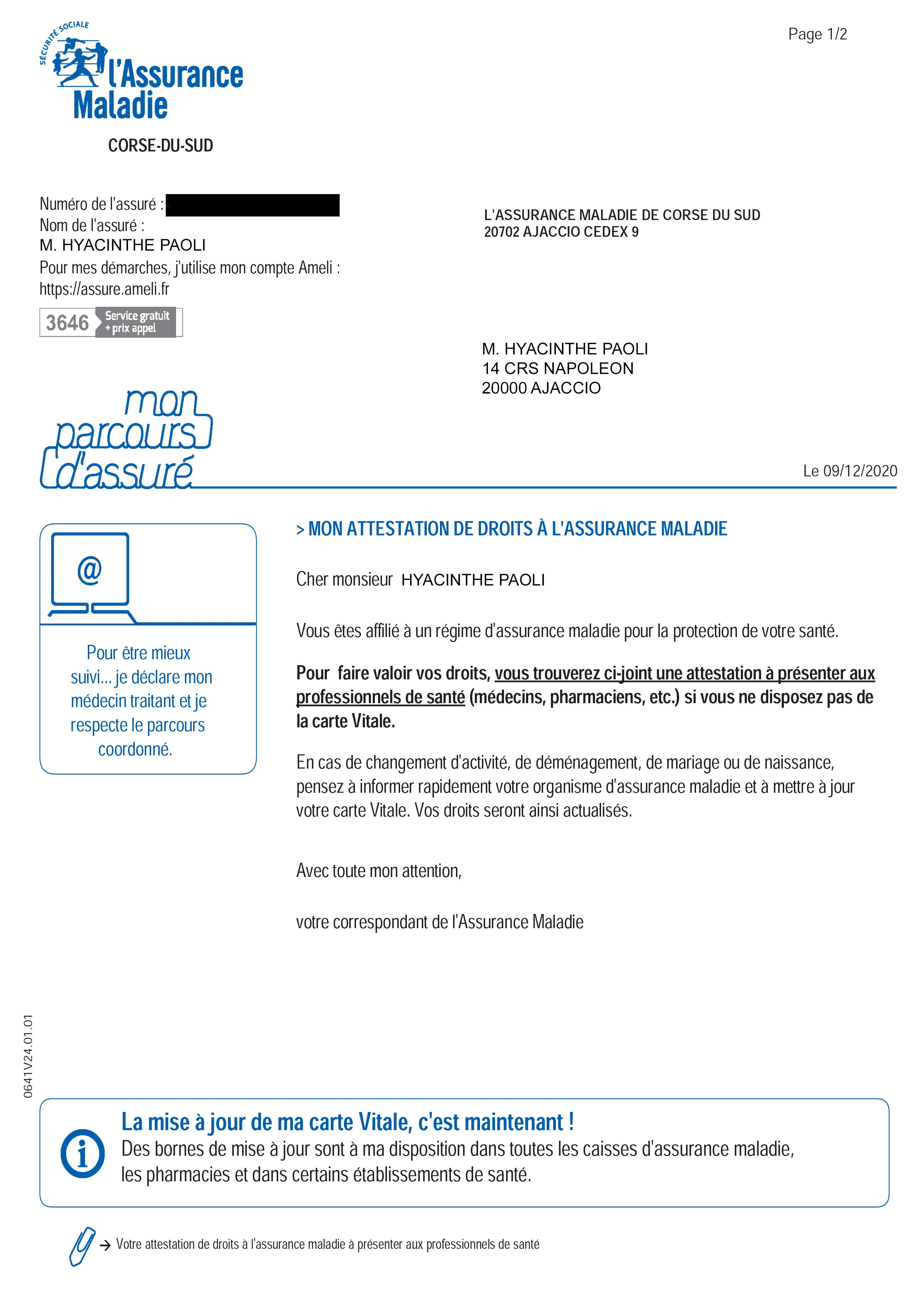 *** Pour des raisons de confidentialité, tous les numéros de Sécurité Sociale doivent être masqués par l'intéressé(e) préalablement au téléchargement de l'attestation d'assurance maladie.