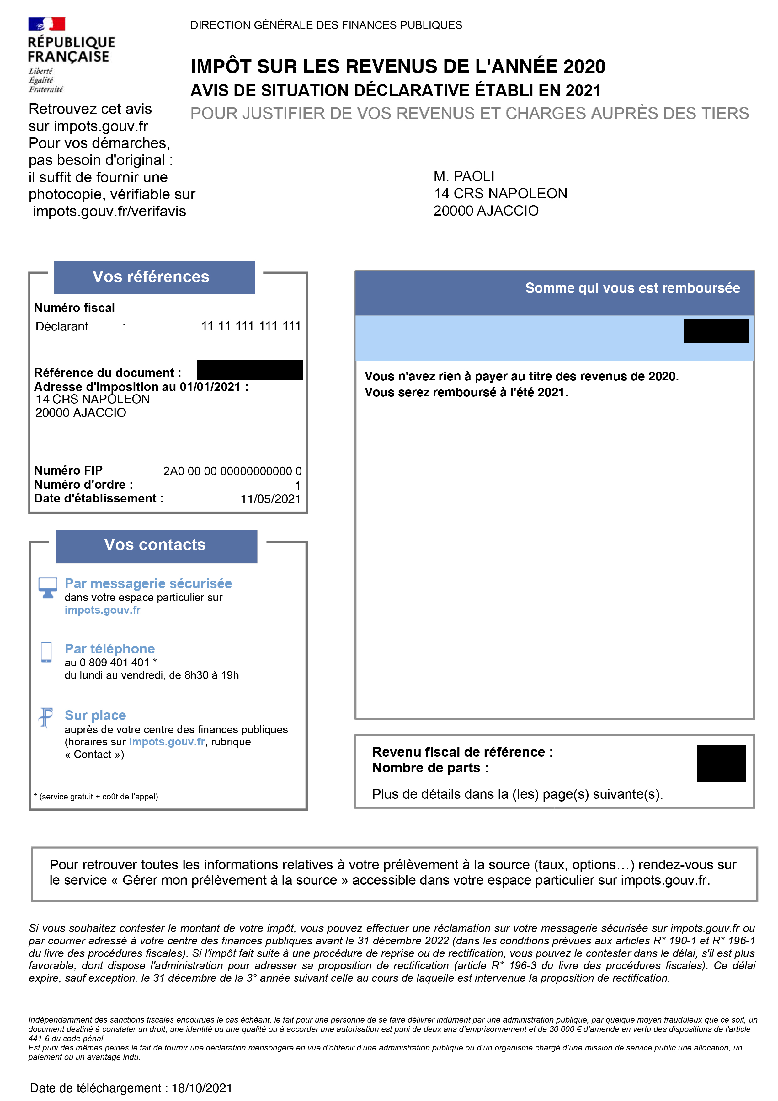 ** Pour des raisons de confidentialité : les montants correspondant aux revenus et à l'imposition doivent être masqués par l'intéressé(e) préalablement au téléchargement de sa situation déclarative à l'impôt. Attention l'Avis de Situation Déclarative à l'Impôt sur les Revenus n'est pas un justificatif qui atteste d'un changement récent de domiciliation fiscale à n'importe quel moment de l'année. Plus d'informations sur notre FAQ.