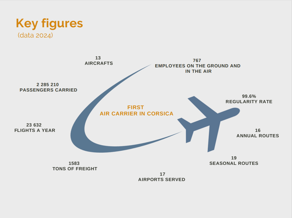 • Annual Public Service routes set up between Corsica and the mainland (between the four Corsican airports and Marseilles/Nice), and Paris-Orly to and from Ajaccio, Bastia, Calvi and Figari (routes operated in a joint venture with Air France).