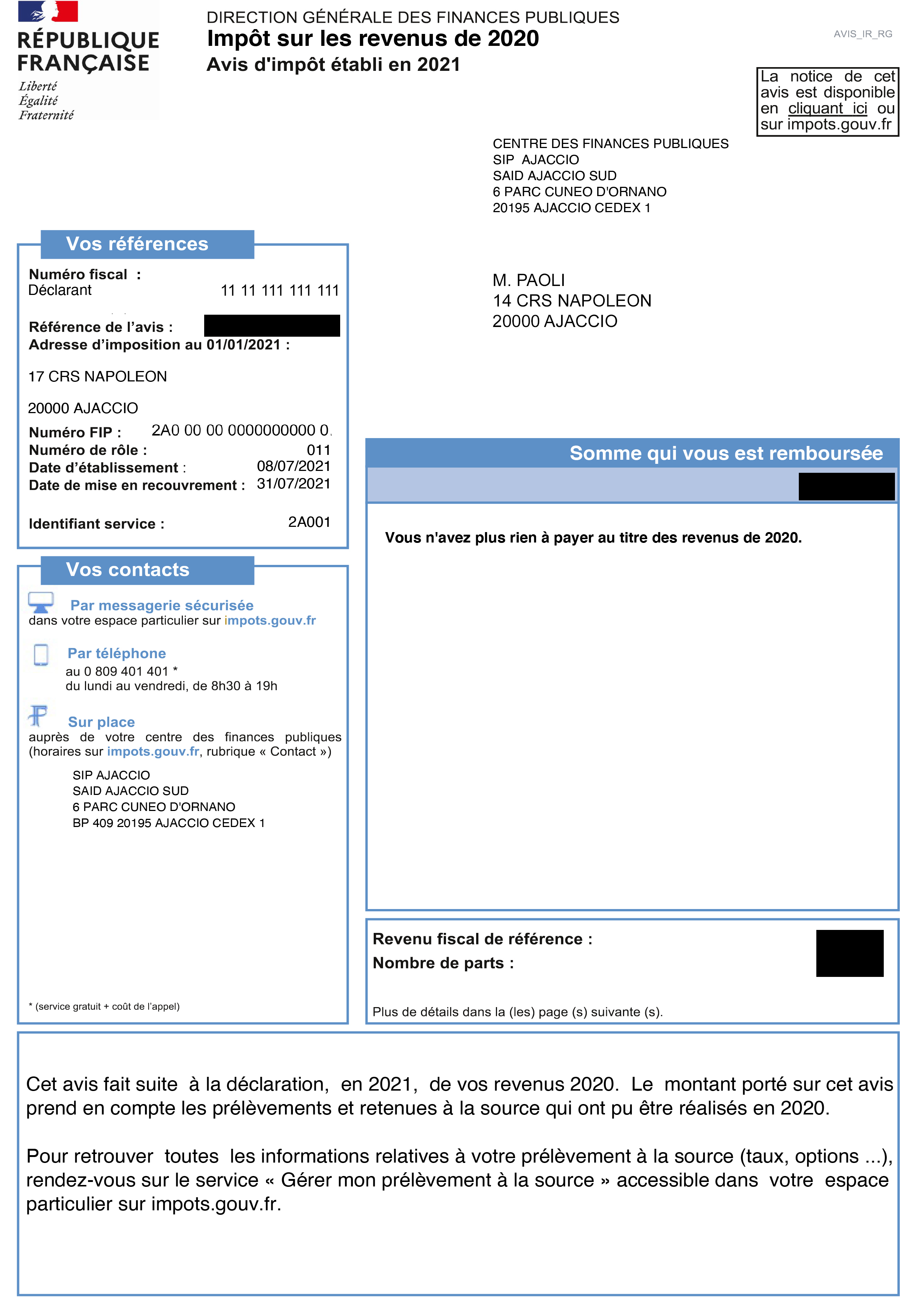 * Pour des raisons de confidentialité, la référence de l'avis et les montants correspondant aux revenus et à l’imposition doivent être masqués par l'intéressé(e préalablement au téléchargement de son avis d'impôt sur les revenus.